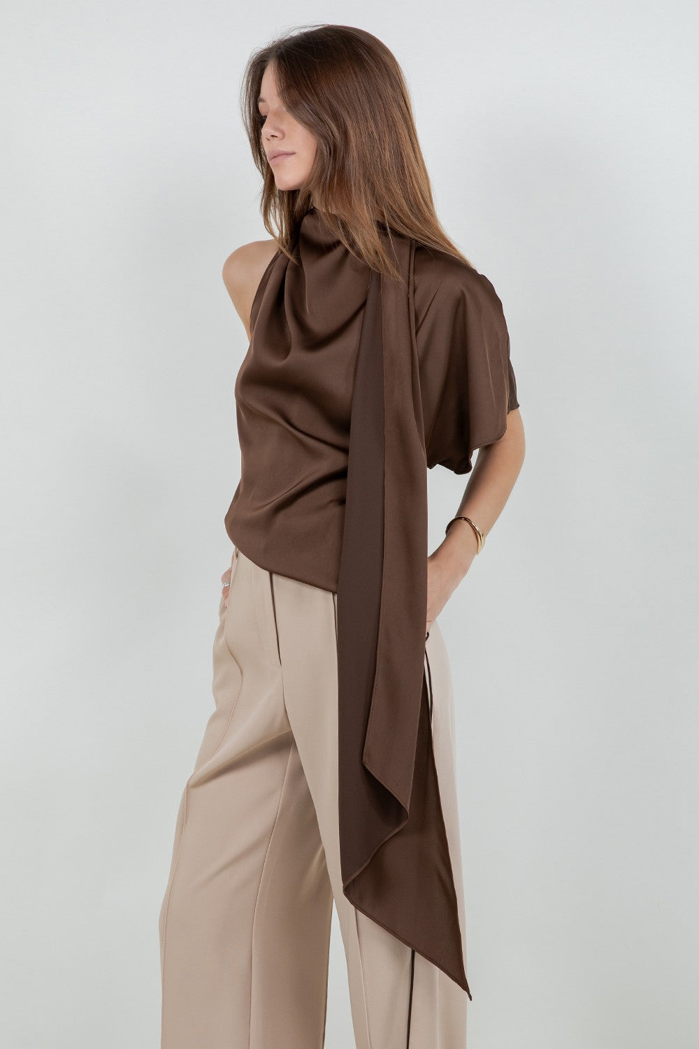 ASYMMETRICAL DRAPED GOWN IN GREEN