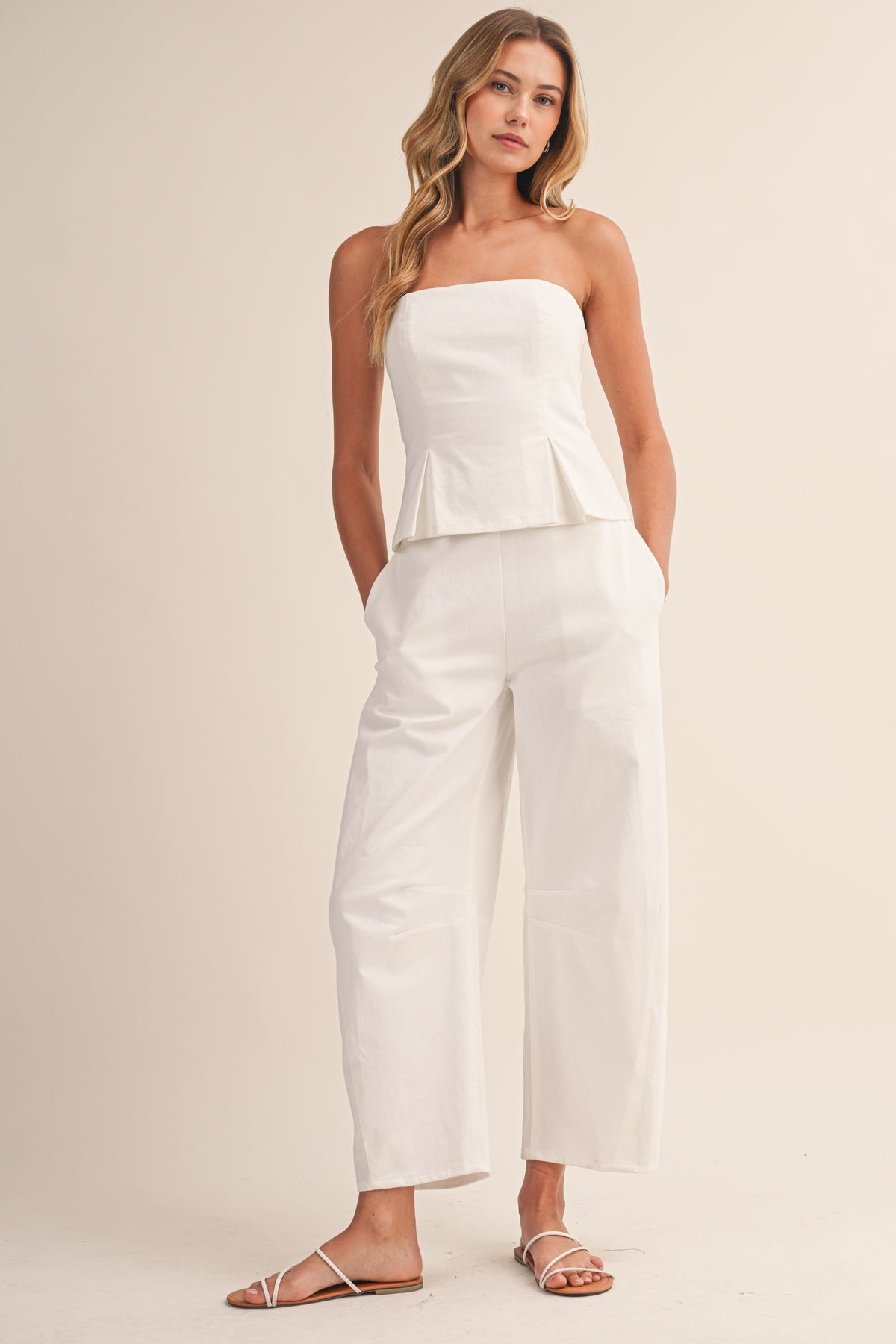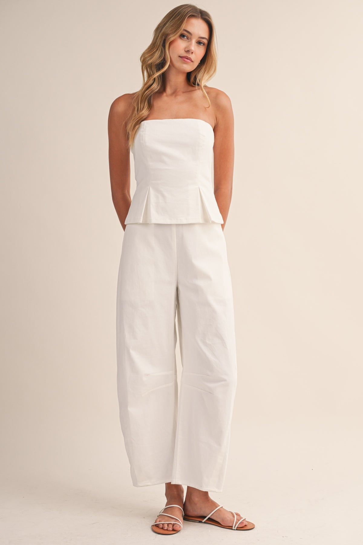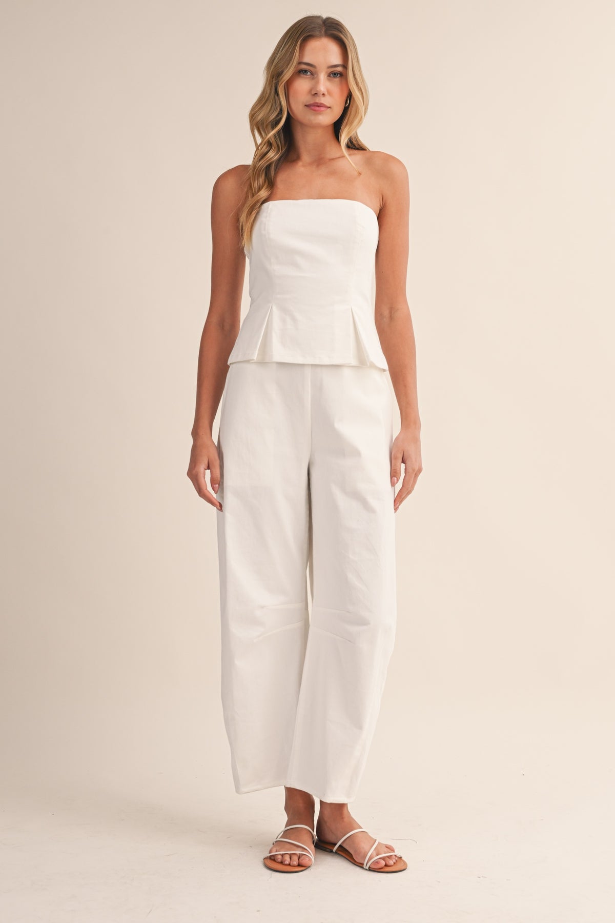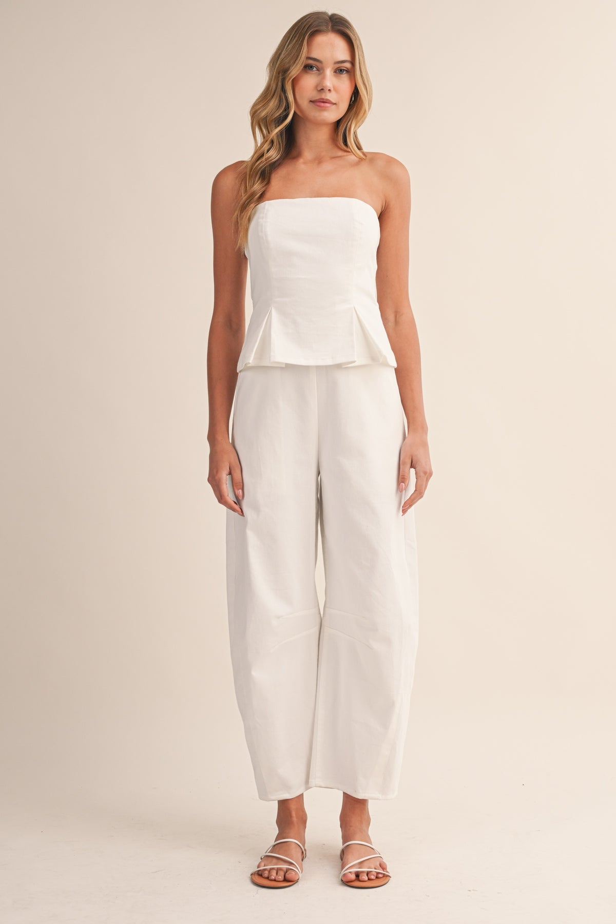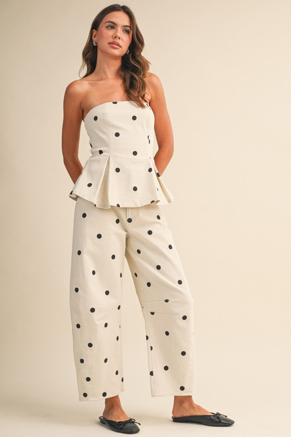 (pre order april) Polkadot Strapless Peplum Top And Barrel Pants Set