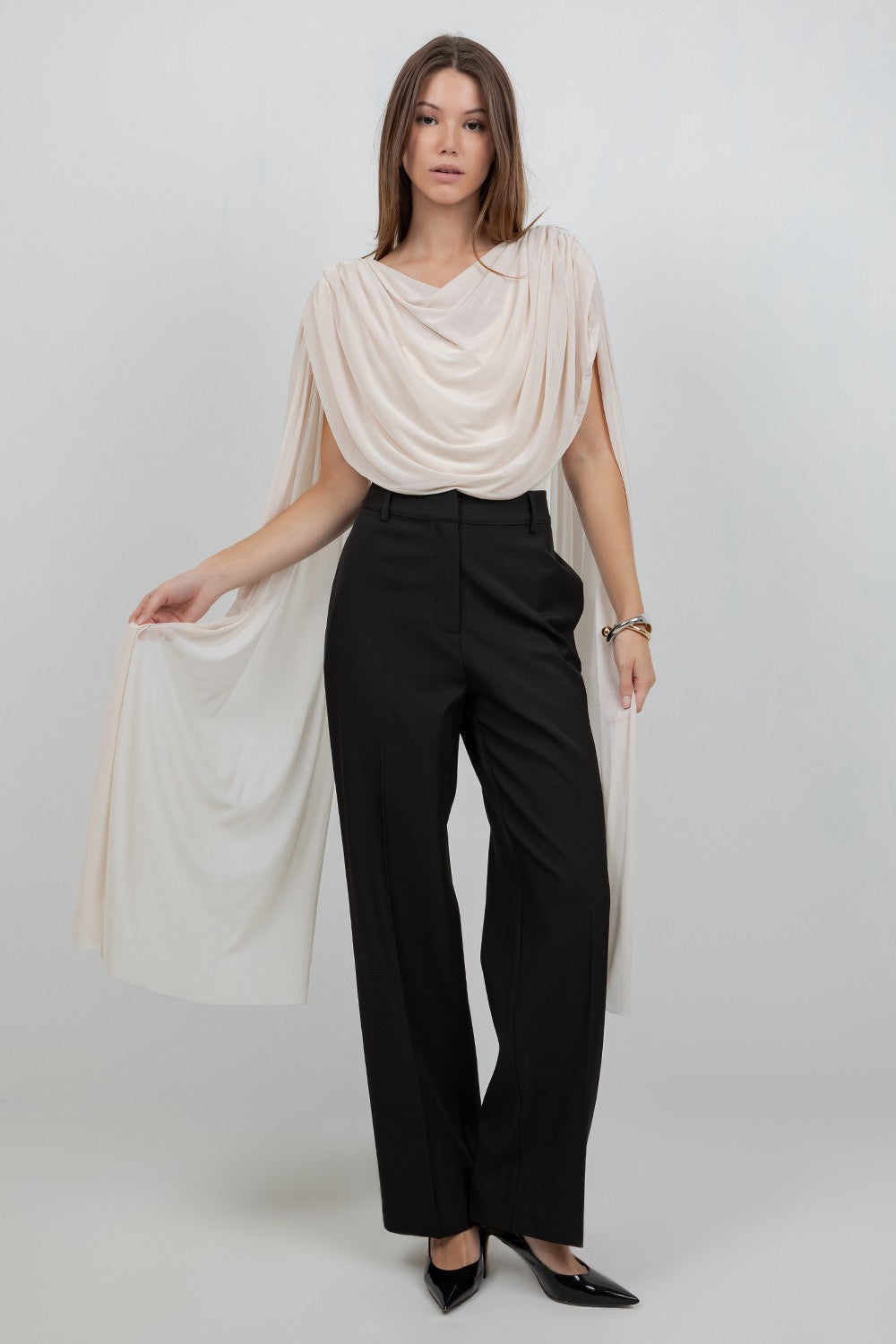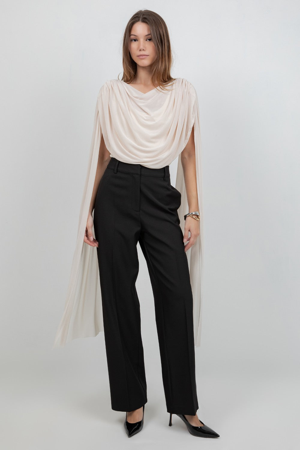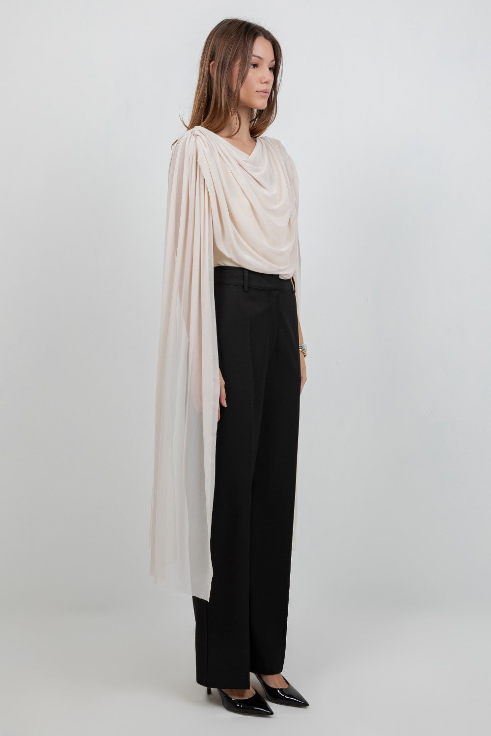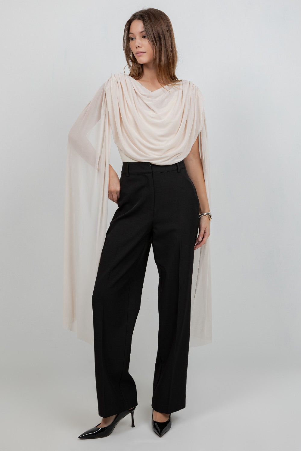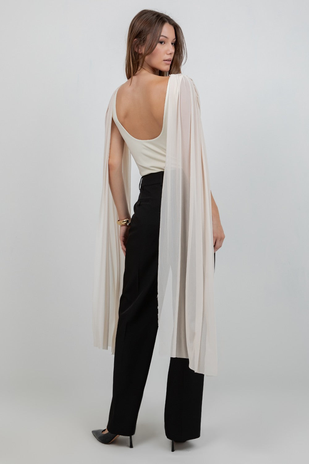 (PRE ORDER END-FEB) Knitted Bodysuit With Contrast Mesh Drape Cape